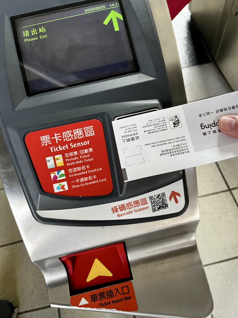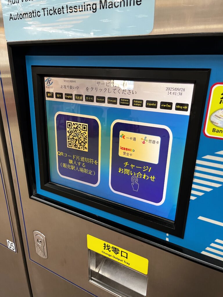 チケット販売機:数カ国言語対応、日本語で購入可能。現金(台湾ドル)クレジットカード(一部機種)・交通系ICカード