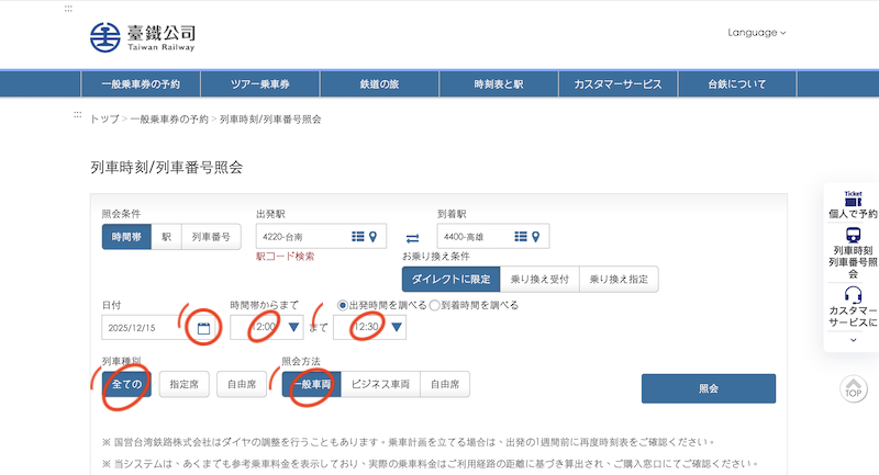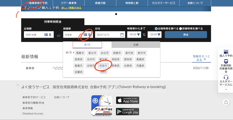 ※本記事内で使用している台湾鉄道の画面画像は、操作説明を目的として一部を引用しています。表示内容や仕様は予告なく変更される場合がありますので、最新情報は必ず台湾鉄道公式サイトをご確認ください。