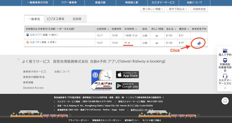 ③照会検索で、2便見つかりました。下段の『自強109』が予約できる列車です。所要時間が37分と短く、『乗車券を予約』の枠に切符の図が描かれていますよね?このマークがある列車が事前予約ができます。