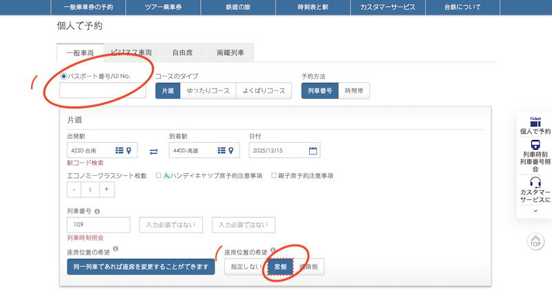 ④購入にあたって、日本人をはじめとする外国人は、パスポート番号を入力します。座席は振り分けられますが、窓側もしくは通路側の希望はできます。混んでいない時は希望通り座れます。