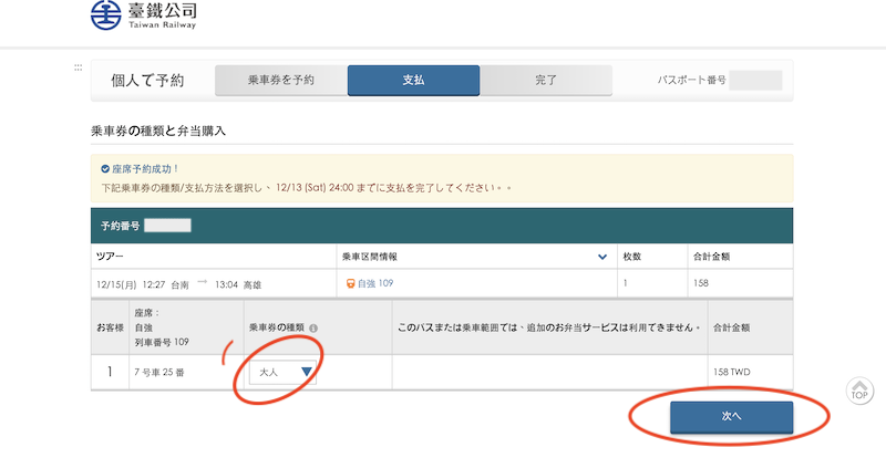 ⑤予約内容を確認して、『次へ』をクリックします。乗車券の種類を確認して『大人』を選択します。この区間の料金は、158NTD(約790円)です。
