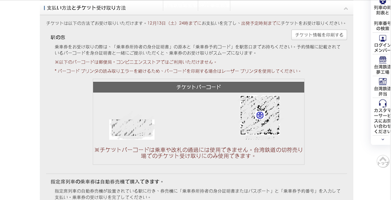 ⑦これで列車の予約が完了です。『チケットバーコード』が発行されていますが、これは台湾鉄道の切符売り場でのチケット受け取りにのみ使用できるものです。