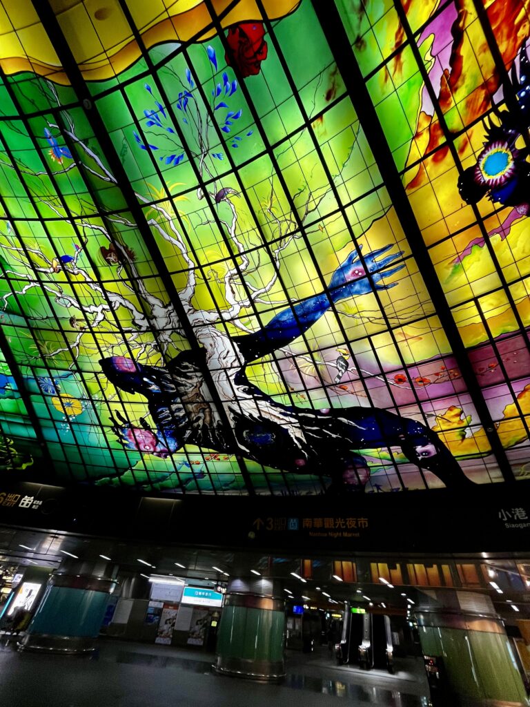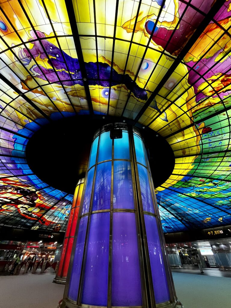 天井とホールの中心に立つ2本の柱が、ステンドグラス調に装飾され、独特の世界観が広がっていました。絶対立ち寄って、見る価値があります。