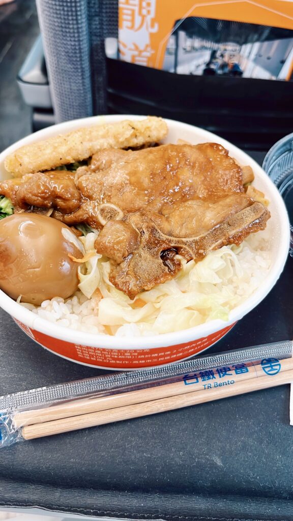 台湾鉄道(台鉄)が販売する名物駅弁で、1900年代初頭の日本統治時代に始まりました。当時の駅弁文化を受け継ぎ、現在も木箱風の容器や素朴なおかずが特徴です。代表的な排骨弁当は、豚排骨の揚げ物と煮卵、野菜を乗せたシンプルな一品で、列車内や駅売店で手軽に購入できます。旅情を感じられる台湾旅行の定番グルメです。