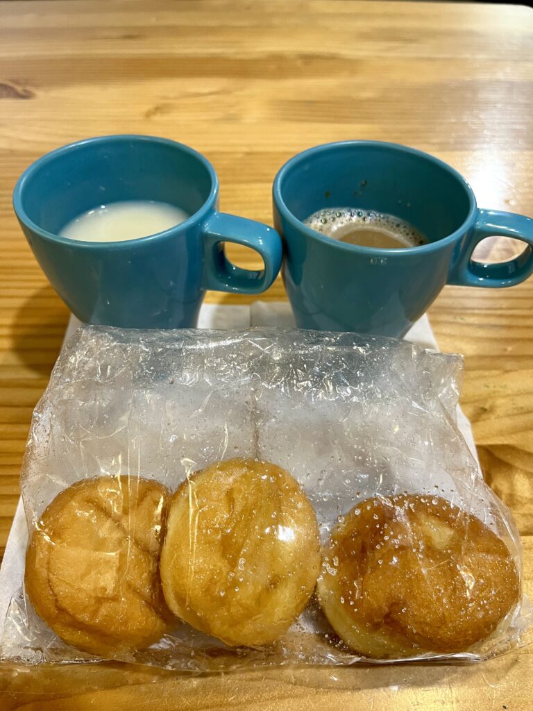 8:30 おはようございます。昨日は結構歩いたため疲れが溜まっていたので、遅めの起床となりました。朝食は昨日購入したミニドーナツ、他のホテルでいただいたインスタントコーヒー、日本から持参したスープとホステルの無料の紅茶で準備しました。