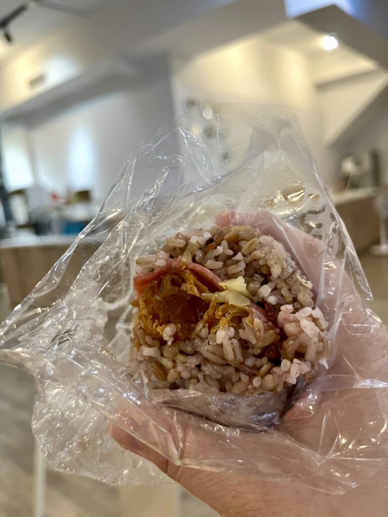 7:30 おはようございます。朝食はおにぎりが食べたくて、近くの露店を発見します。総合雑穀が入ったミックス米のおにぎり40元と豆乳紅茶15元を購入しました。小ぶりながらお手頃価格で、餅米は硬めに炊かれておりかみごたえありました。私は特にこの数年はパンよりお米を食べるようになり、台湾おにぎりは本当に飽きません。