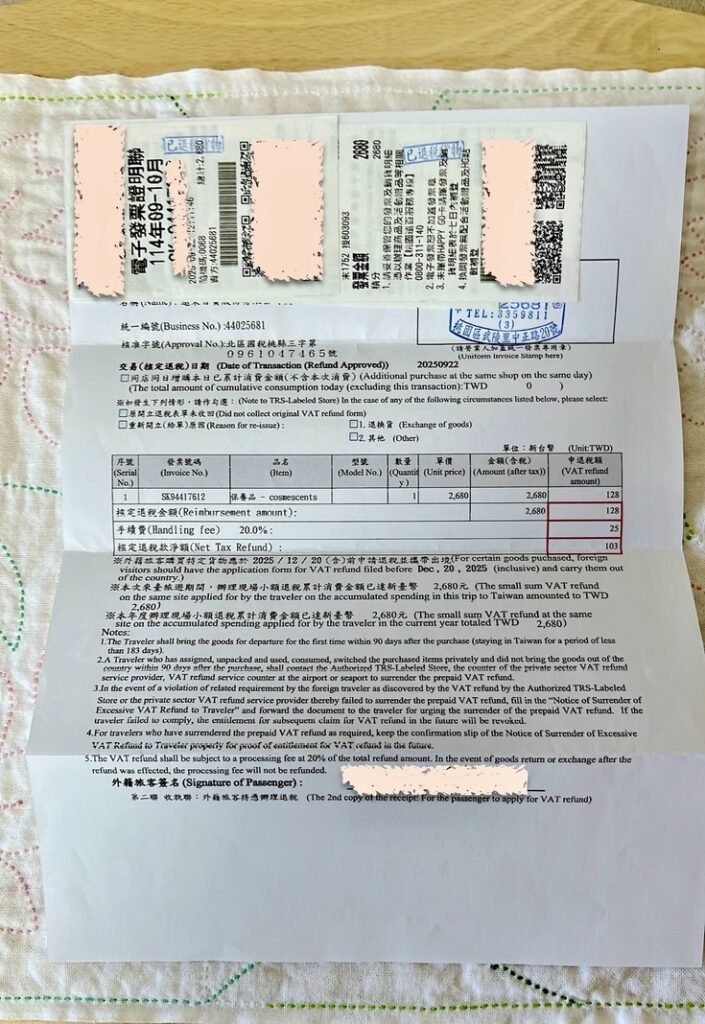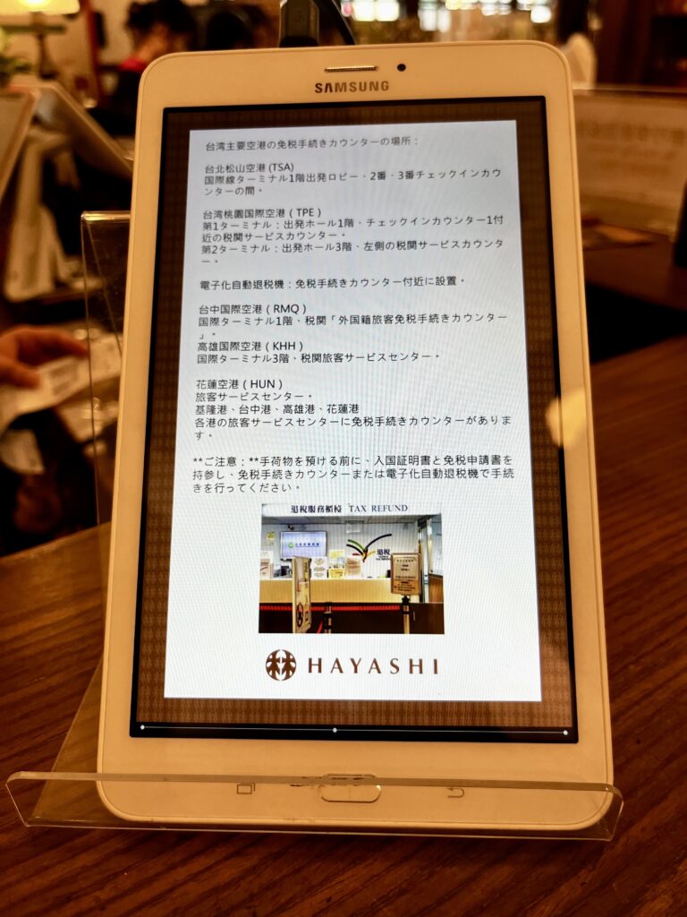 なお、レストランでの支払いは、免税対象に含まれないです。私は2100NTDほどの購入でしたので、迷わず手続き。この書類を持って、帰りの桃園国際空港で還付を受けました。