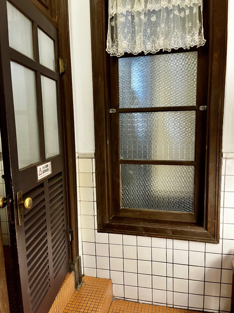 その隣にある小部屋には専門店があり、デパートの高級感を演出。床・壁も昔のまま、天井は低めです。階段脇にトイレがあり、狭いながらも機能的です。