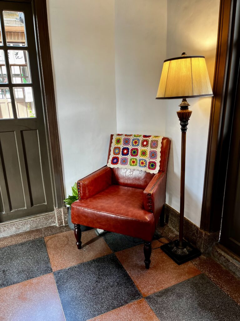 アンティークな椅子に、鍵あみの毛糸カバーがかかっており、ほっと一息つける展示。