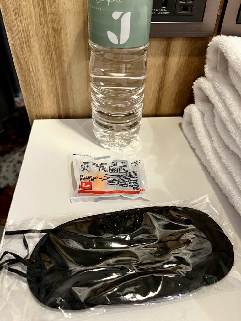 パスポートを提示し、ホテルカードにサインをします。「ラウンジでは、今おやつタイムです。ワッフルと台湾アイスを楽しんでください。」とご案内されながら、耳栓とアイマスクを手渡し。