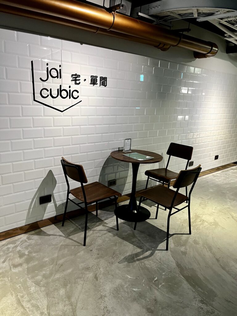 エレベーターを降りると、カフェのようなテーブルが2つが目に入ります。