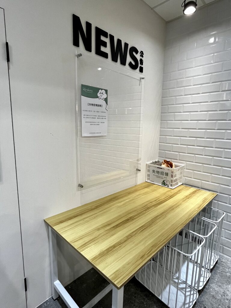 室内は清潔で明るく、女性が安心して使えます。エアコンもしっかりと効いており、奥にはカゴと作業机が置いてありました。