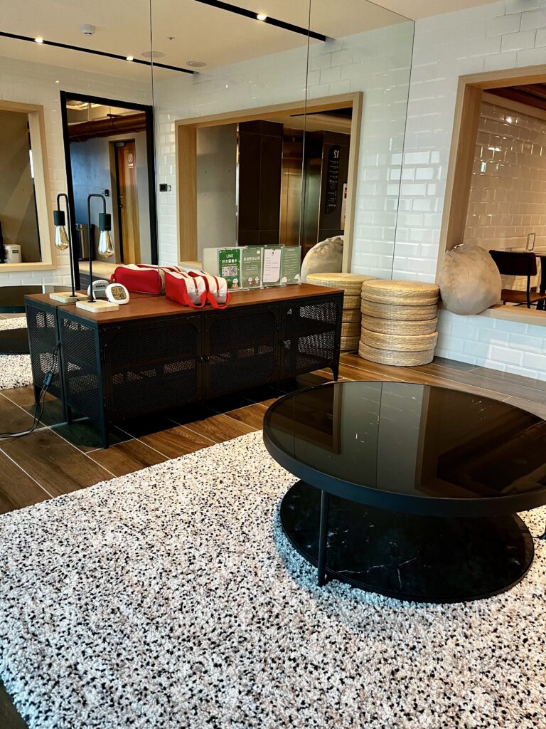 入り口にはユーバイク(レンタル自転車)が並び、便利そうですね!1階のエントランスにはスタッフが在中、声がかかりホテルフロントの階数を案内してくれます。