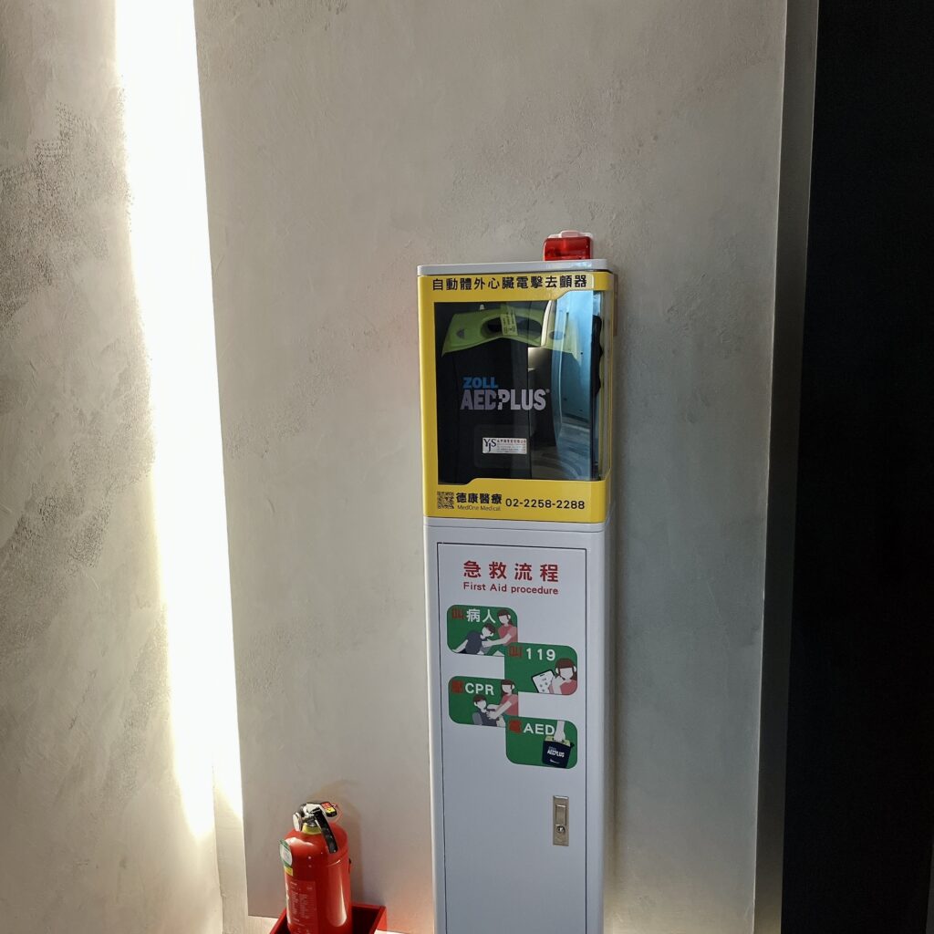 8階へ降りてみましょう。エレベーターの前にはAEDも完備。