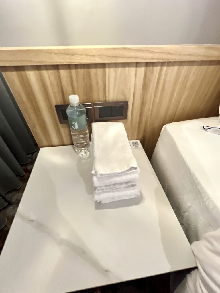 サイドテーブルにはフェイスタオルとペットボトルの水が置かれています。