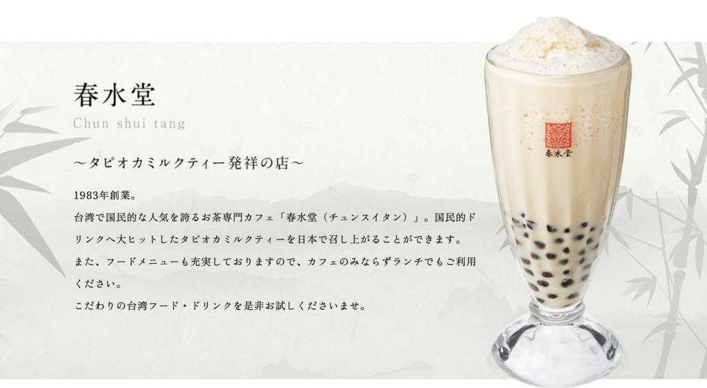 日本にも海外から多くの名店が入ってきていますが、元祖タピオカミルクティーと言えば、春水堂