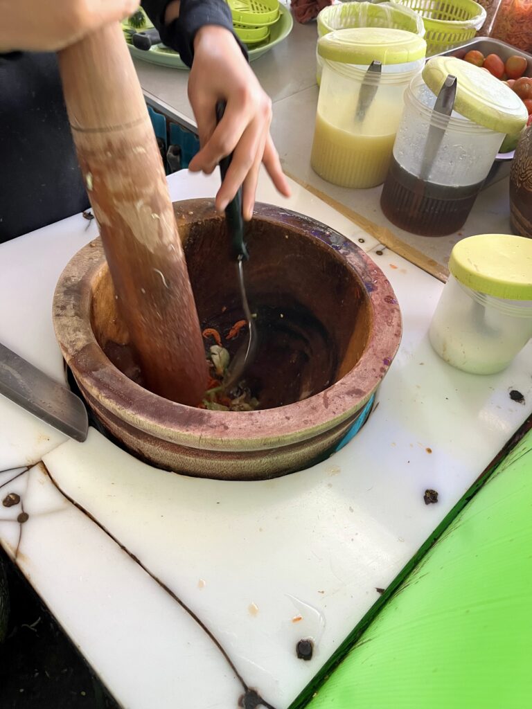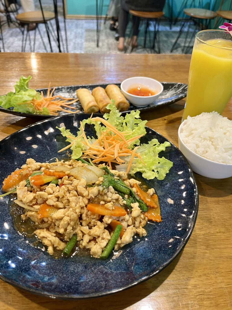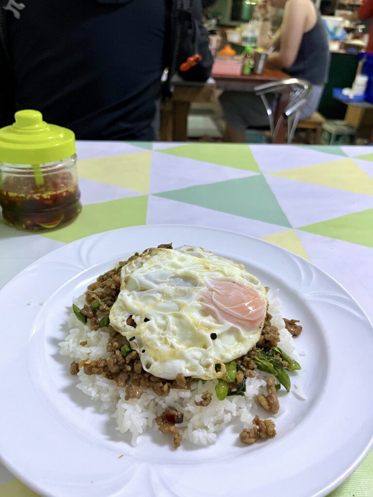 私のよく通っていたサンティサム地区では、カオマンガイやガパオが50バーツ、ソムタムが40バーツからでした。大盛りにしたり、目玉焼きを付けたりしてもプラス10バーツです。毎日通っても1食約250円からなので、安心して続けられます。