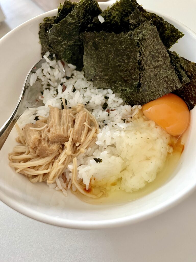 ご飯を食べたい時には、電子レンジで作ったなめ茸と納豆・半熟卵・海苔を乗せたどんぶりにする。