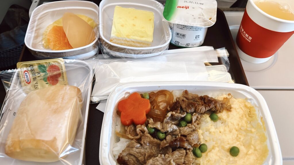機内食は牛丼を選ぶと、想像以上においしかった!その他は軽く煮た果物や甘いケーキと続きます。