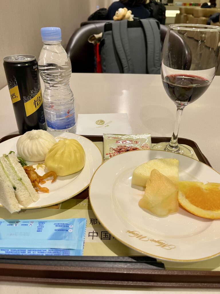 少なめに料理を持ってきた上。軽く赤ワインをいただきます。ラウンジ内は大声で話す人はいなく、私の想像していた中国ではありませんでした。