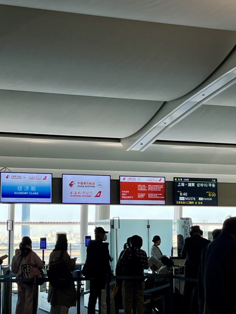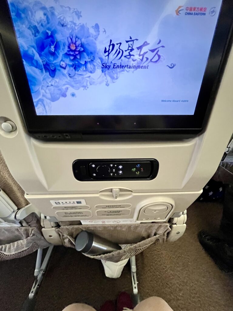 7:55 搭乗開始 になりました。中国東方航空MU576に乗り込みます。機内は満席でかなり混んでいますが、椅子との空間が広いので、ゆとりがありました。