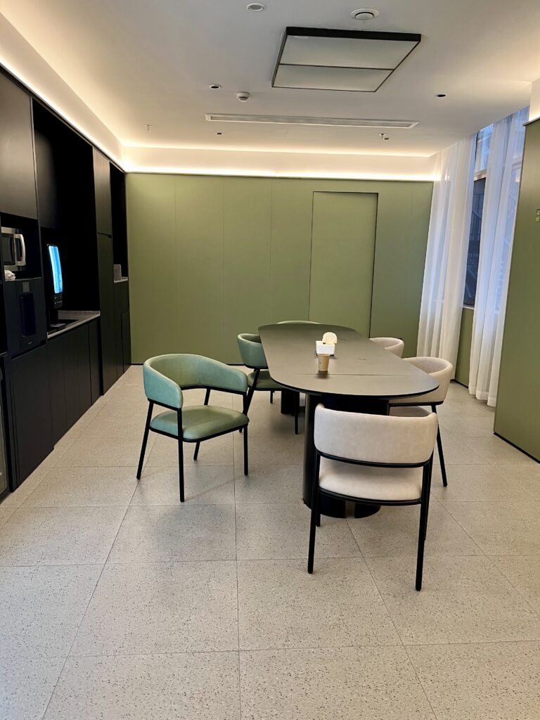 ウォーターサーバー・コーヒーマシーン・電子レンジが置いてあり、真ん中には広いテーブルと椅子が揃っています。
