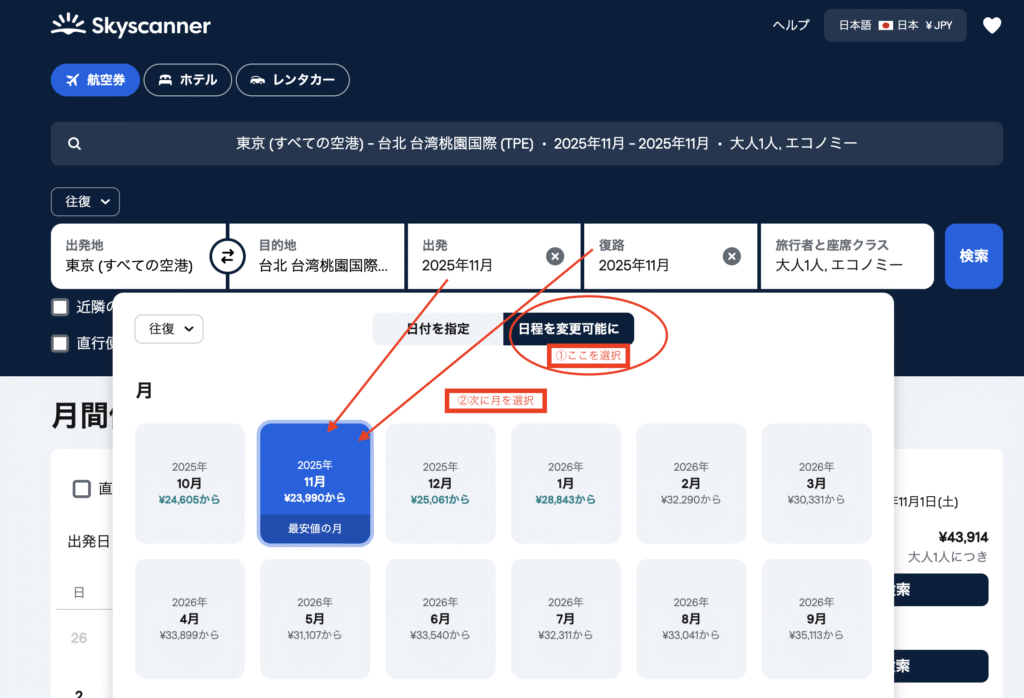 ⒈出発地と到着地を入力した後、出発日と復路の日程を選択します。この際、『日程を変更可能に』をクリックし次に希望する月を選びます。
