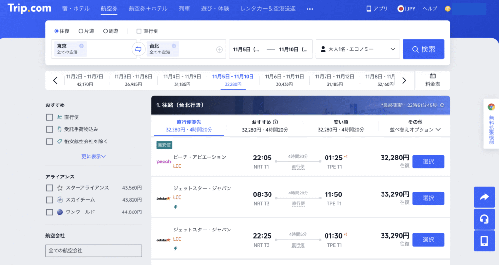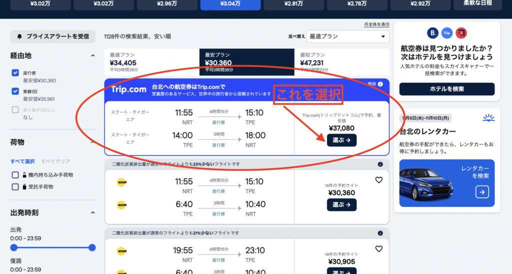 ⒉次に、選んだ日程の航空券を詳しく見ていきましょう。