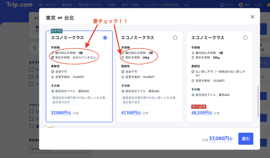 実際にはスカイスキャナーで選択すると、各旅行サイトに直接飛ぶことができ、この画面になります。料金だけでなく、受託手荷物が含まれているのかなどのチェックも大事です。