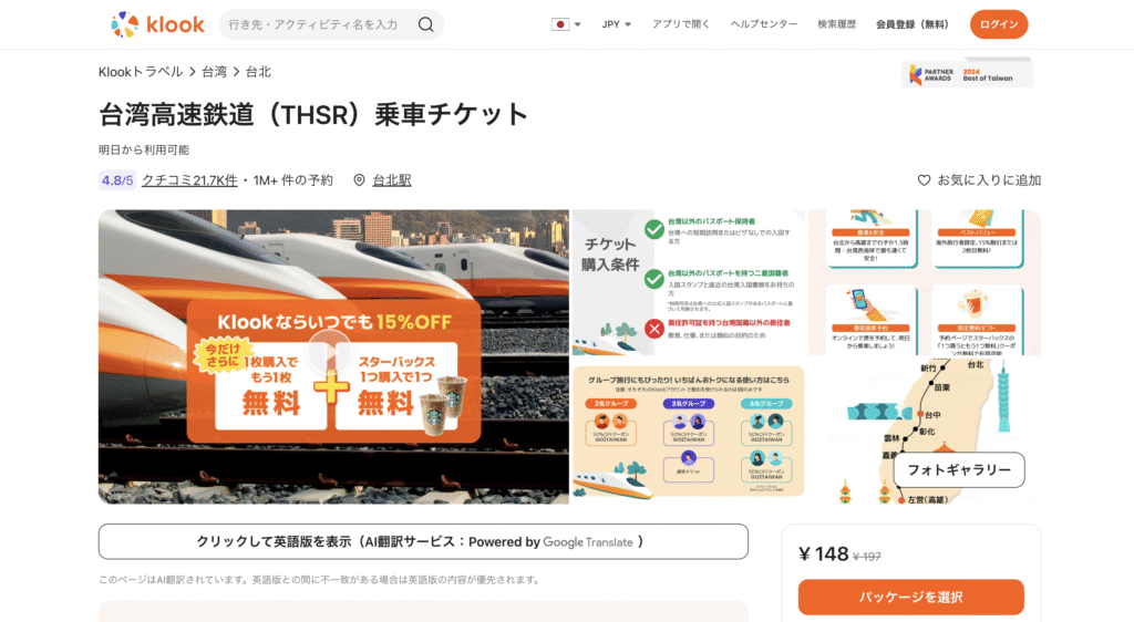 公式サイトから直接購入できますが、旅行サイトのKLOOKとKKdayから予約することができますが、様々な特典がつくKLOOKで予約しました。日程が合うようでしたら、周遊券がお得です。