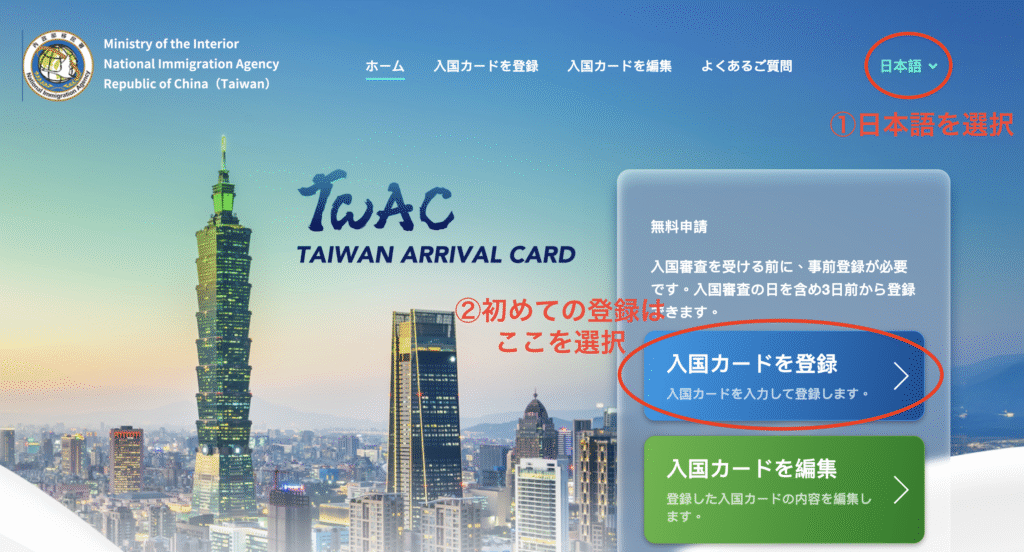 従来の紙の入国カードに代わり、到着3日前までにオンラインで提出する電子化された入国登録制度です。2025年10月1日以降、すべての外国人旅行者(居留証を持たない人)は紙のカードが廃止され、TWACのオンライン登録が義務化されます。登録は無料で、氏名・パスポート番号・滞在先などを入力・パスポート画像をアップロードして自動入力も可能。登録後、確認メールが送信され、入国時はパスポート照合でそのまま通関が処理されます。