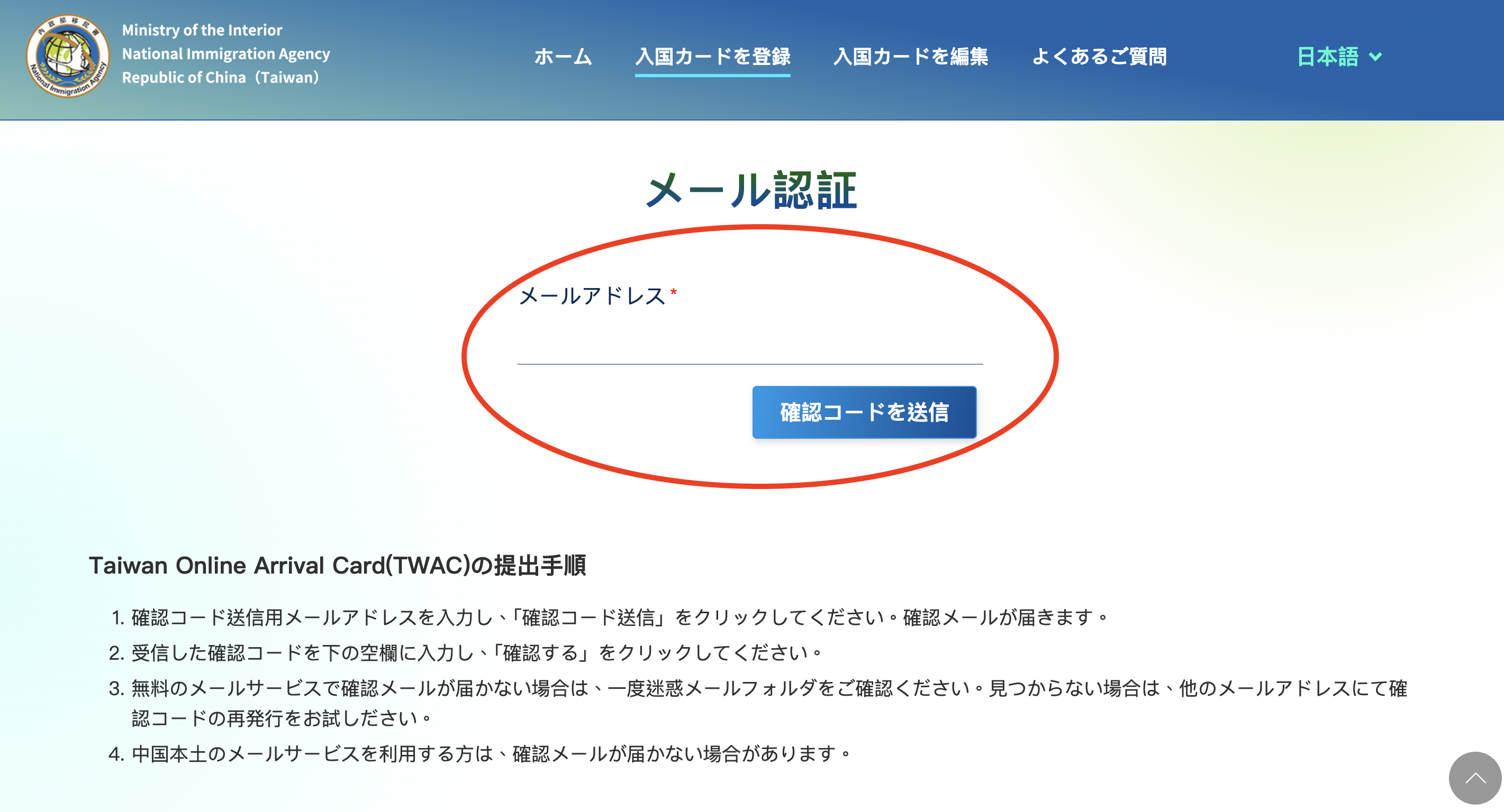 ①TWACの公式サイトを開くと、次の画面が出ます。表示する言語を日本語にすることで、分かりやすく入力ができます。